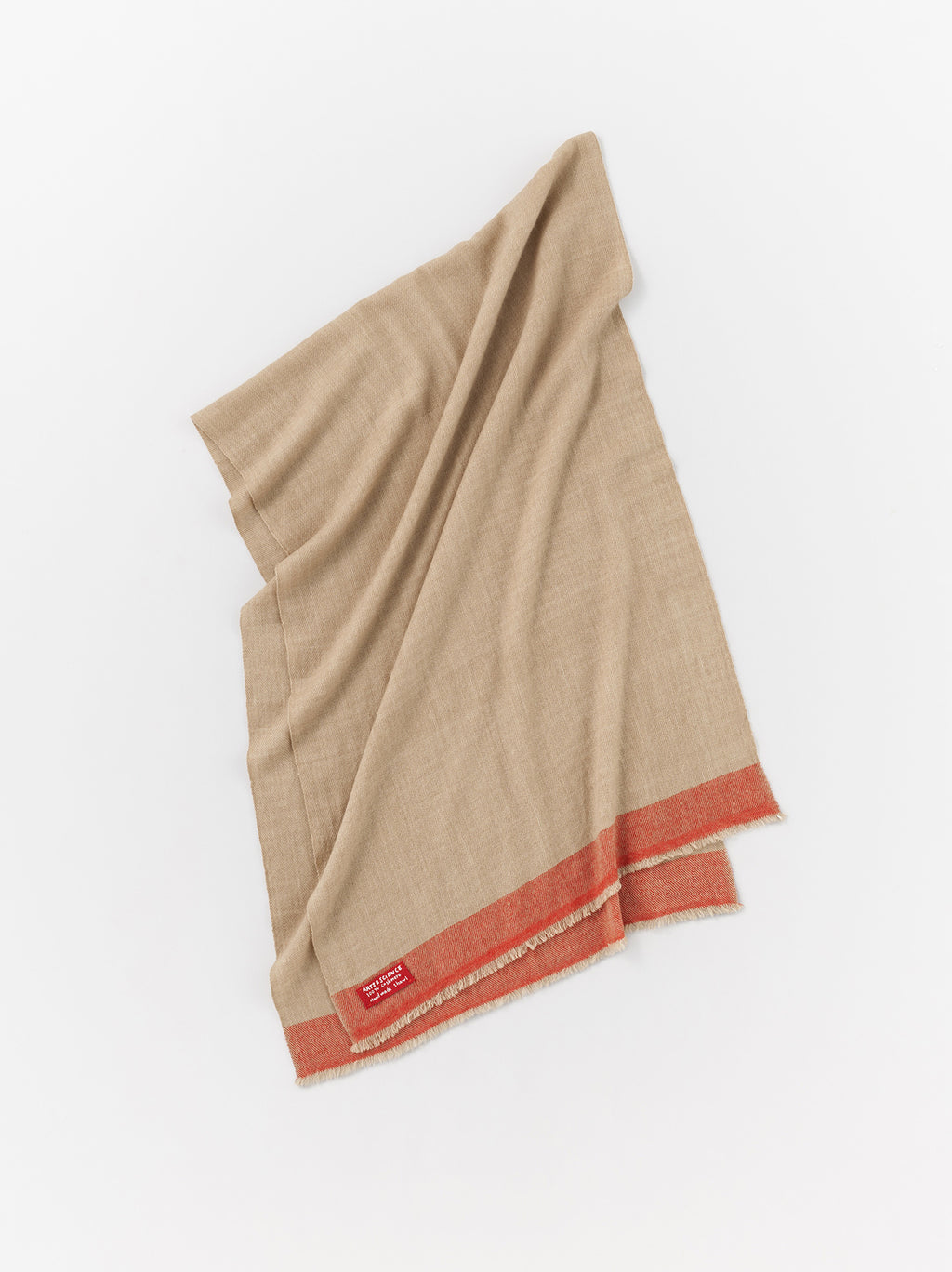 シンプルなフリンジショールのエッジに、コンビネーションカラーを配置したEdge combi color shawl。使用するカシミア生地は、モーター動力の織り機ではなく、手動の織り機を使用している為、過度なテンションがかからずに手織りのようなふっくらとした風合いが特徴。60cmの細幅は首元にも巻きやすく、ジェンダーレスに着用することができる。Natural、Light brown、Blackの3色展開。