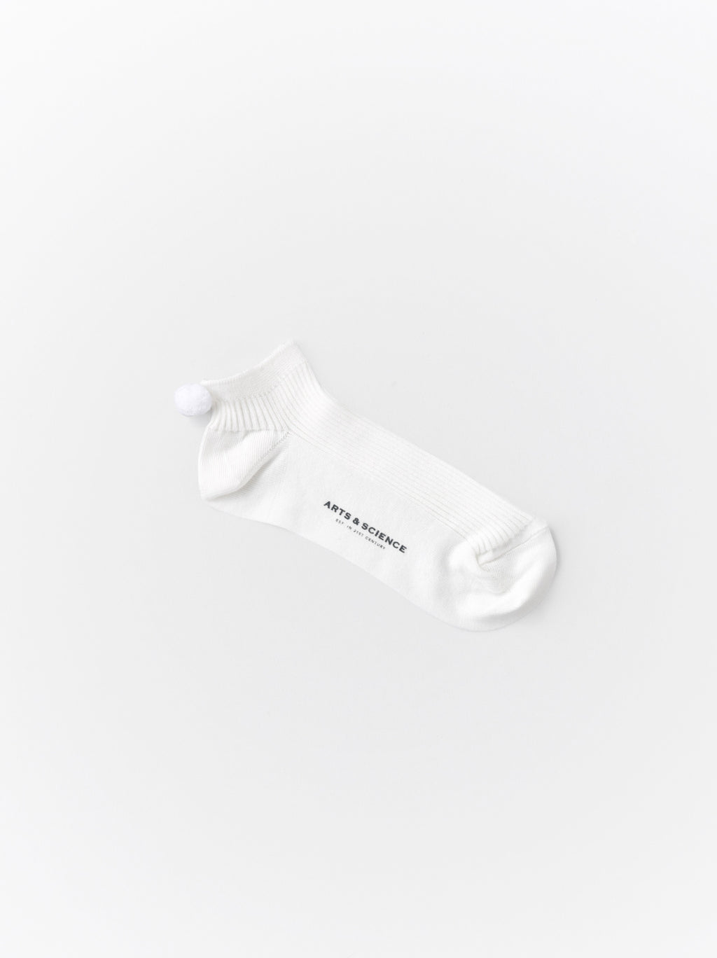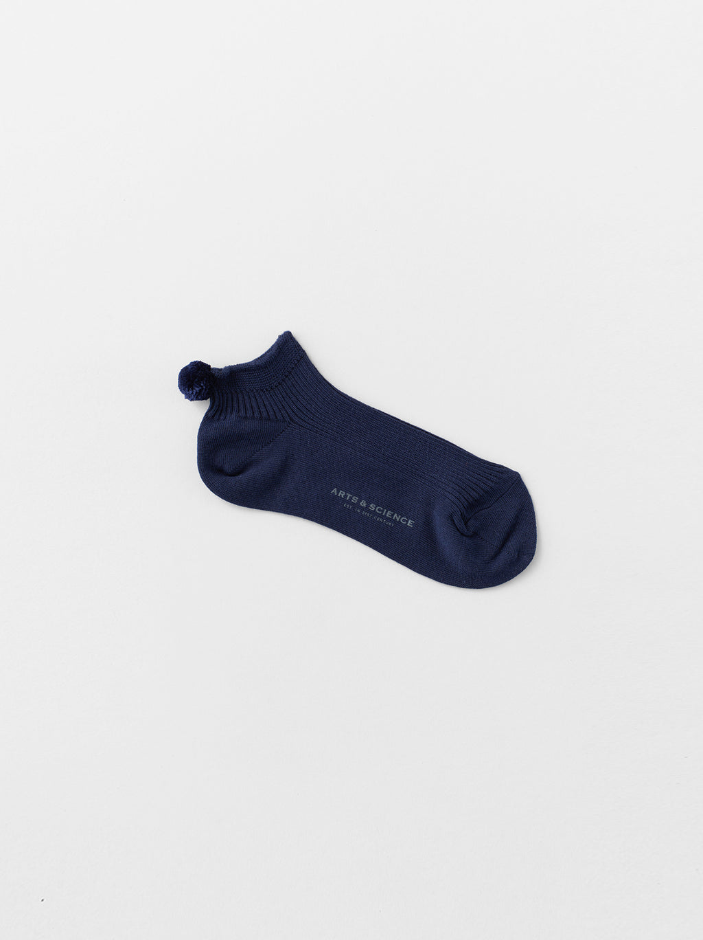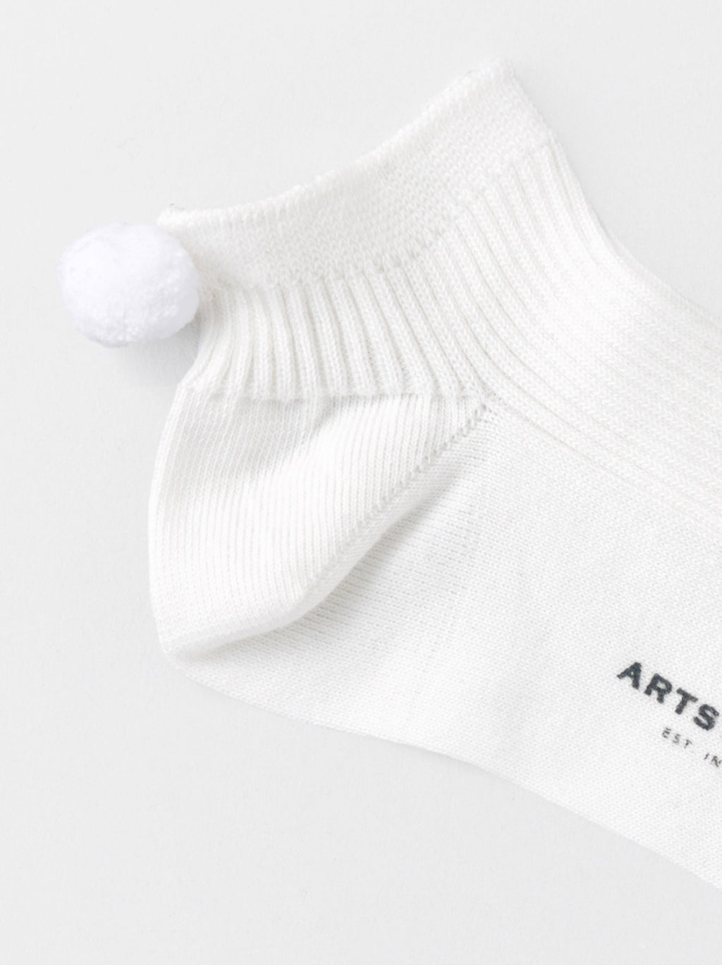 ポンポン付きのショートソックス(ウィメンズサイズ)。かかとのポンポンはデザインだけでなく、歩行などの動きによるズレを軽減するストッパーとしての役割も。締め付け過ぎない立体的なリブで編み上げているため、さらりと通気性も良く快適な履き心地。かかとに付いたポンポンがチャーミングなバックスタイルに。