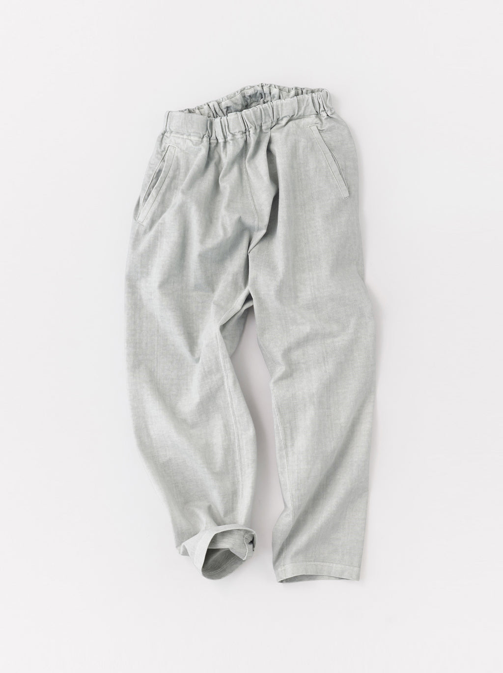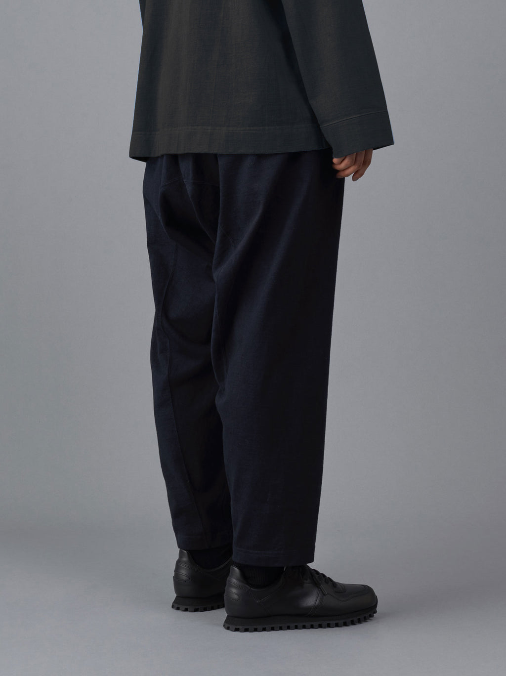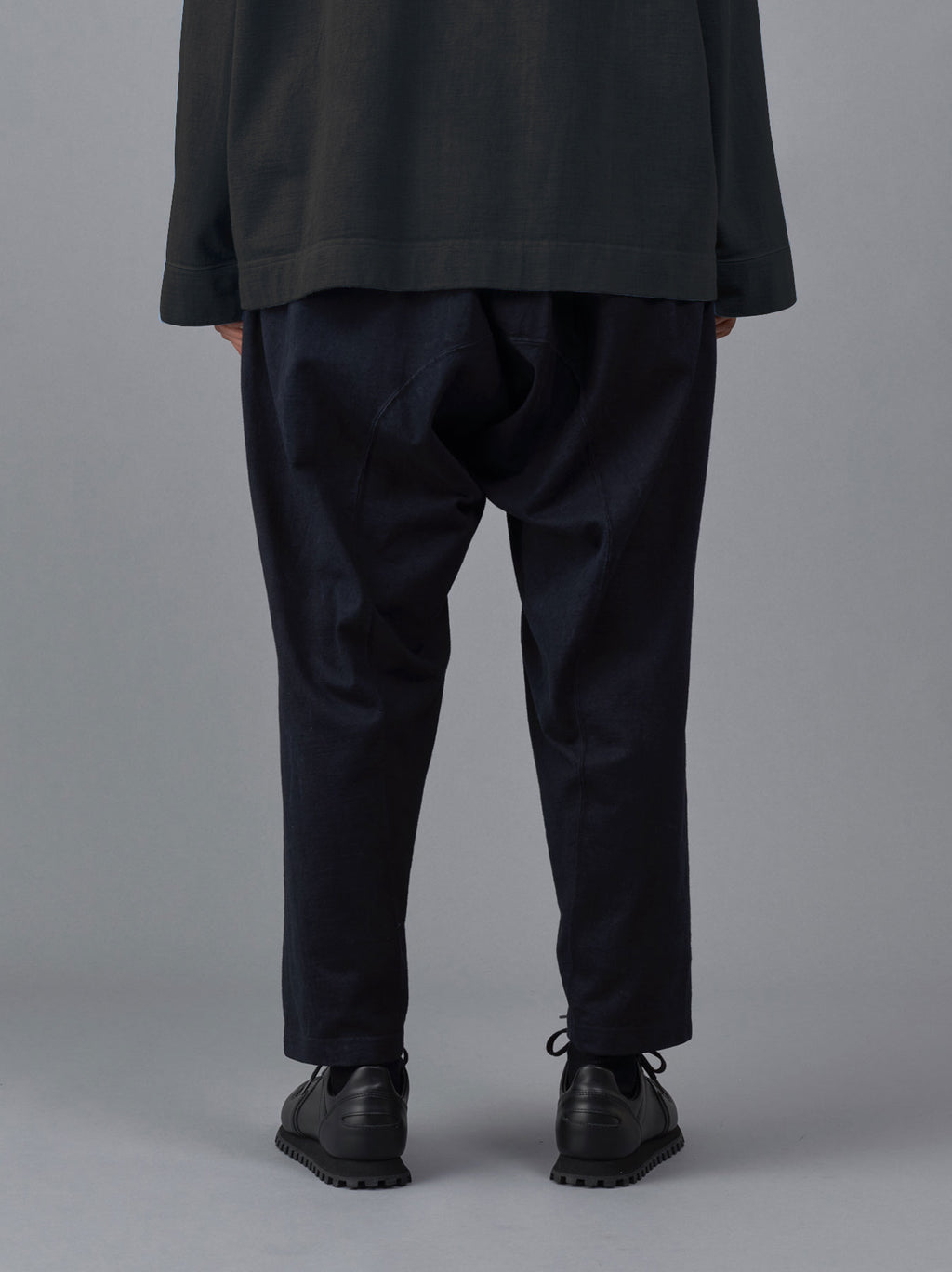 ゆったりとしたリラックスシルエットのテーパードパンツ。股上が深く、程よく落ち感のあるシルエットは、サルエルパンツのような雰囲気を織り込んだカジュアルな印象のパンツ。ウエストはゴムと紐のイージースタイル。生地は空気を含んだ様な柔らかな風合いが特徴の吊編天竺を使用。染色の不均一さによる独自の風合いを持つ生地は、1点1点個体差が生じるのが特徴。同素材のStand collar box shirt、Stand collar box shirt half sleeveと合わせたセットアップとしても。