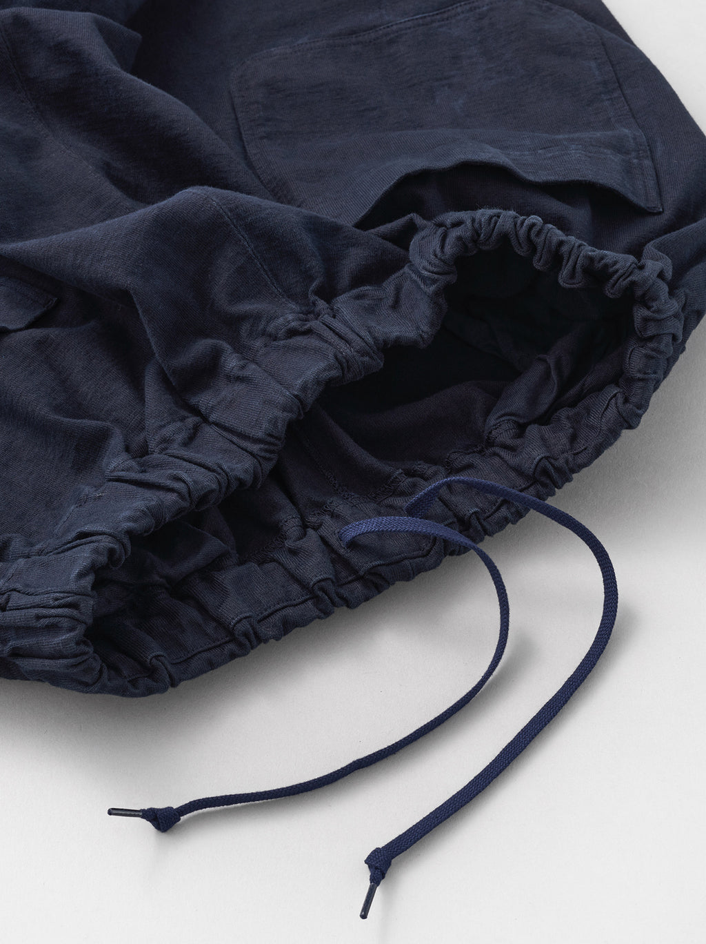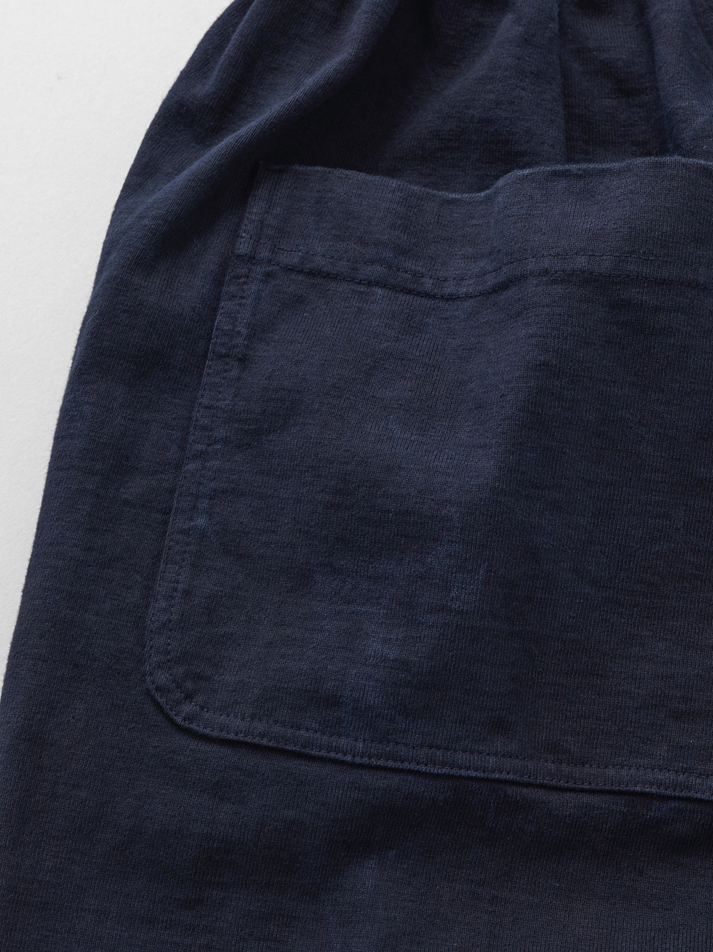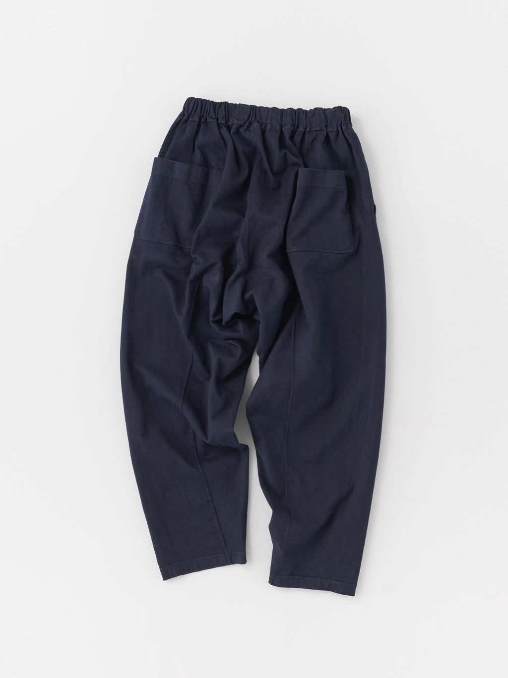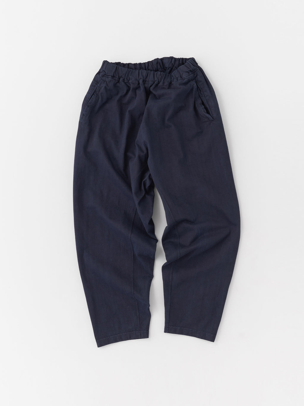 ゆったりとしたリラックスシルエットのテーパードパンツ。股上が深く、程よく落ち感のあるシルエットは、サルエルパンツのような雰囲気を織り込んだカジュアルな印象のパンツ。ウエストはゴムと紐のイージースタイル。生地は空気を含んだ様な柔らかな風合いが特徴の吊編天竺を使用。染色の不均一さによる独自の風合いを持つ生地は、1点1点個体差が生じるのが特徴。同素材のStand collar box shirt、Stand collar box shirt half sleeveと合わせたセットアップとしても。