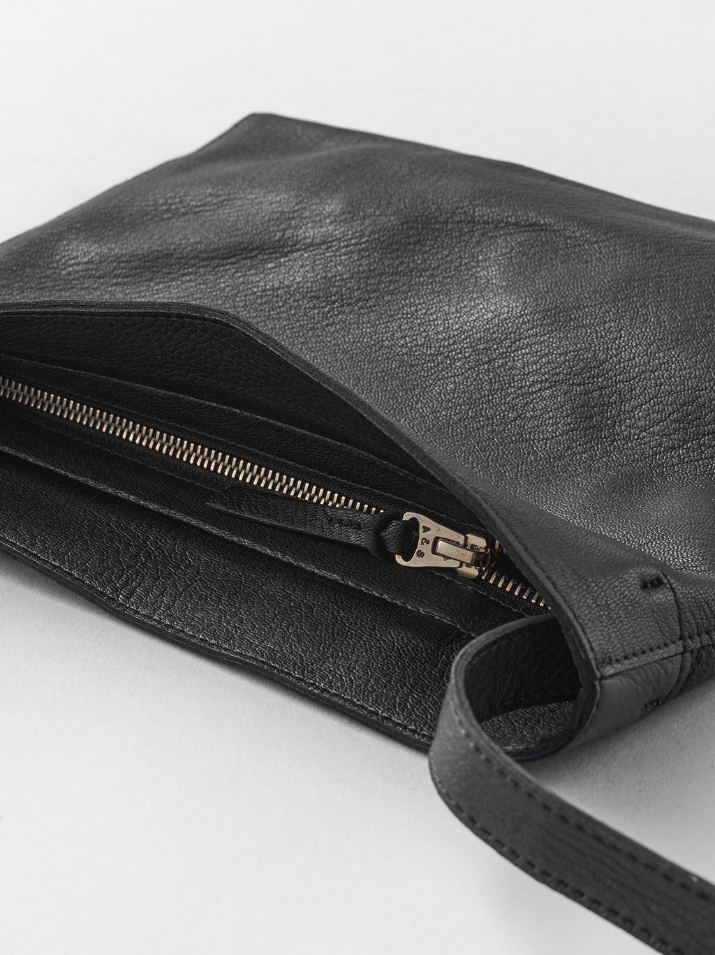柔らかくふっくらとした鹿革を使用した、サコッシュタイプのバッグ。ショルダーストラップは、バッグの内側で結び目を作ることで好みの長さに調節が可能。斜め掛けとしても、ワンショルダーのトートとしても、ストラップの長さで自在に変化する。開口部はファスナーで開閉でき、機能性にも優れている。内側には傷がつきにくいよう、適度な厚みがあるヌバックの革を使用することで耐久性もあり、しっかりとした作りに。裏なしの1枚仕立てで、軽く仕上がっているのも魅力。内側にはポケットが1つ付き、ポケットの表面にARTS&SCIENCEのストレートロゴの箔押しが入る。Black、Dark brownの2色展開。