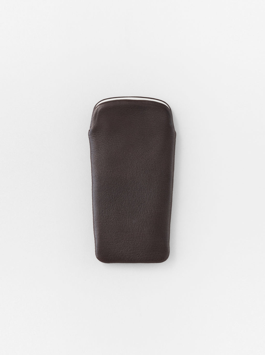『縫い目や金具が出来る限り表に見えない』をコンセプトに製作されたPush gamaguchi glasses case。つまみがないデザインの口金を使用しているのが特徴。表は柔らかくふっくらとした鹿革を用い、内側には傷がつきにくいよう、ヌバックの革を使用している。メガネケースとしてだけではなく、ペンケースとしても。