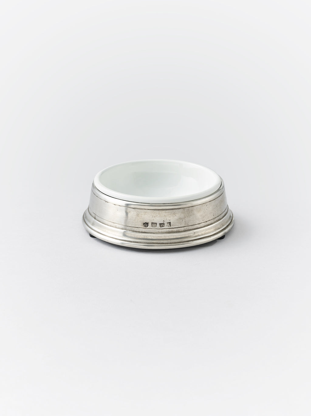 イタリア・COSI TABELLINIのペットボウル ミニ。ピューターとセラミックのコンビネーションが美しい一品。内側のボウルは取り外し可能なため、容易に洗浄することができる。土台の脚底部分には滑り止めが付く。