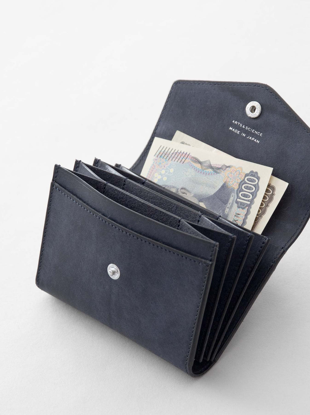 A&S定番のJabara walletシリーズをベースに考案された、Flap jabara purse。コンパクトながらも特徴であるジャバラポケットのディテールを取り入れることで複数のカードポケットを備え、紙幣を折らずに収納できる実用性に富んだアイテム。貫通していないポケットはコインケースとしても使用できる。革はヌバック調のマットな表情が特徴の厚めのしっかりした牛革を使用。使い始めはヌバック調のマットな表情だが、使い込むほどに艶が上がり味わい深い経年変化が楽しめる。