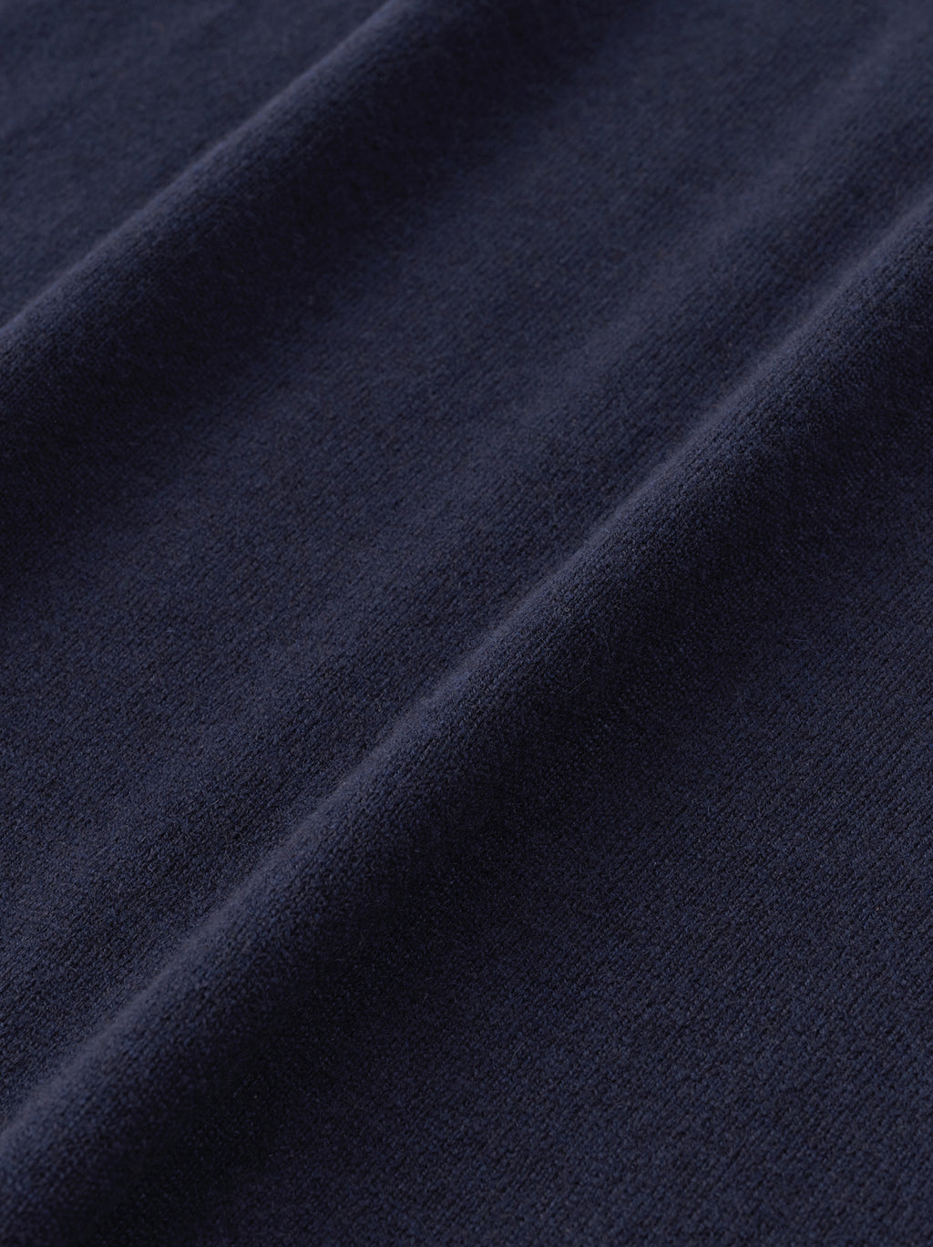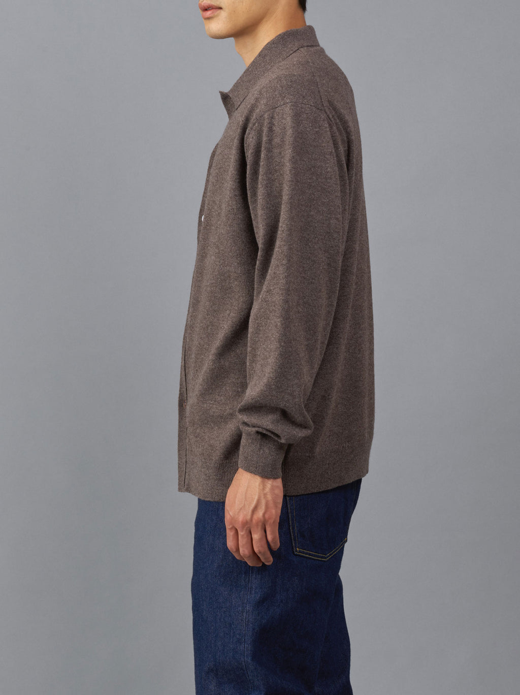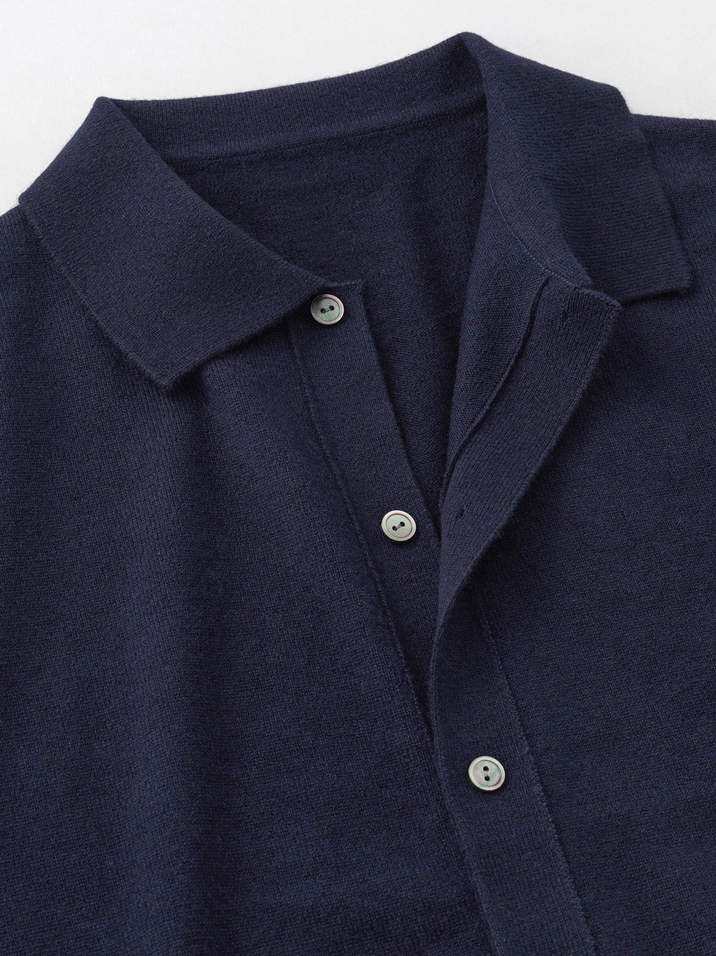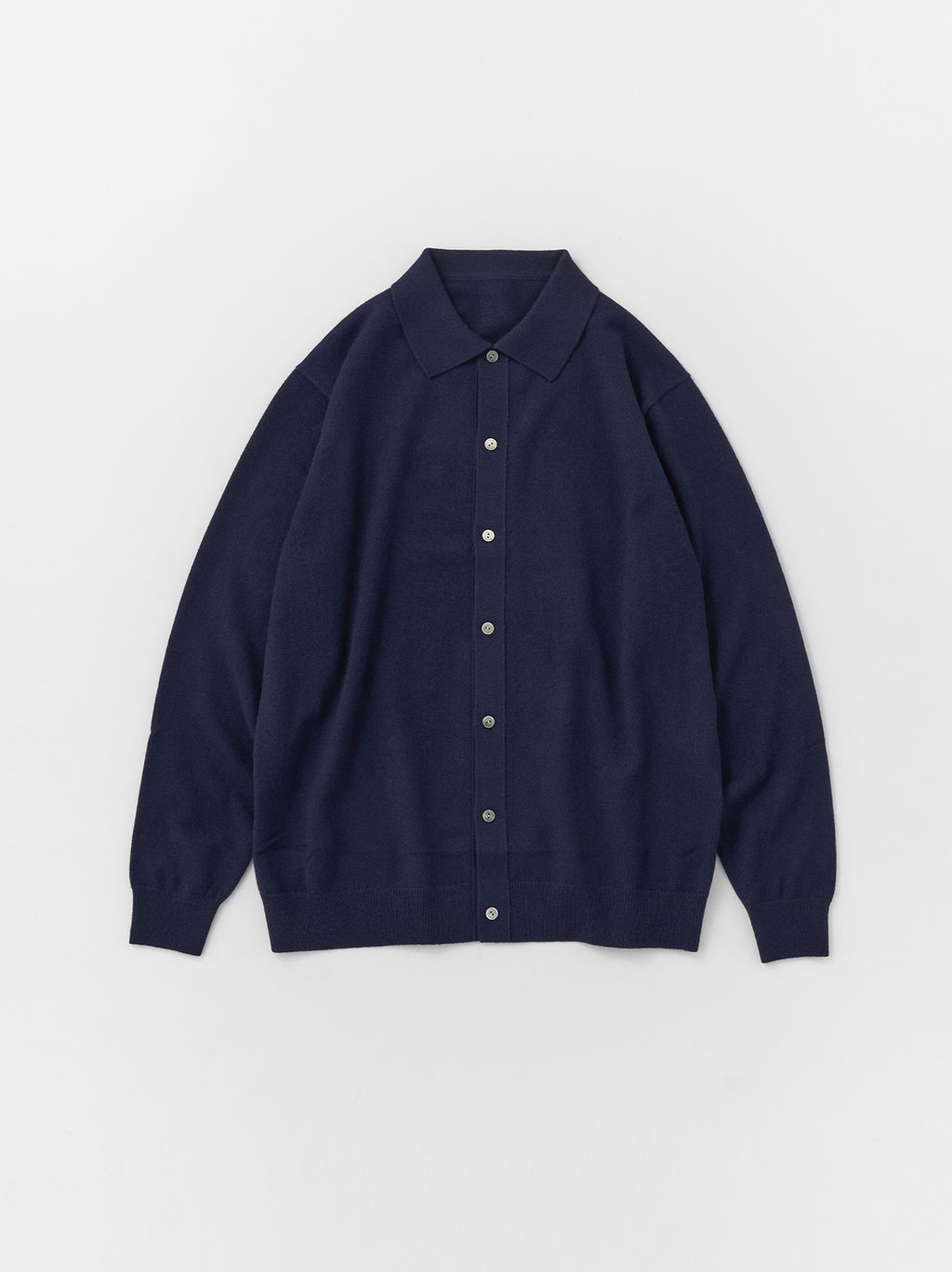 カシミア100%のCollared cardigan。襟付きのデザインが上品な印象のニットカーディガン。生地はカシミア山羊の毛質に良い影響を与えるとされる寒暖差が激しい地域に限定し、選りすぐりのカシミアを使用。カシミアならではの優しい肌あたりで、ウールと比べて温度調節に優れ、気温が安定しない秋の暮れから、真冬、春先まで活躍する。Dark navy、Cocoa、Blackの3色展開。