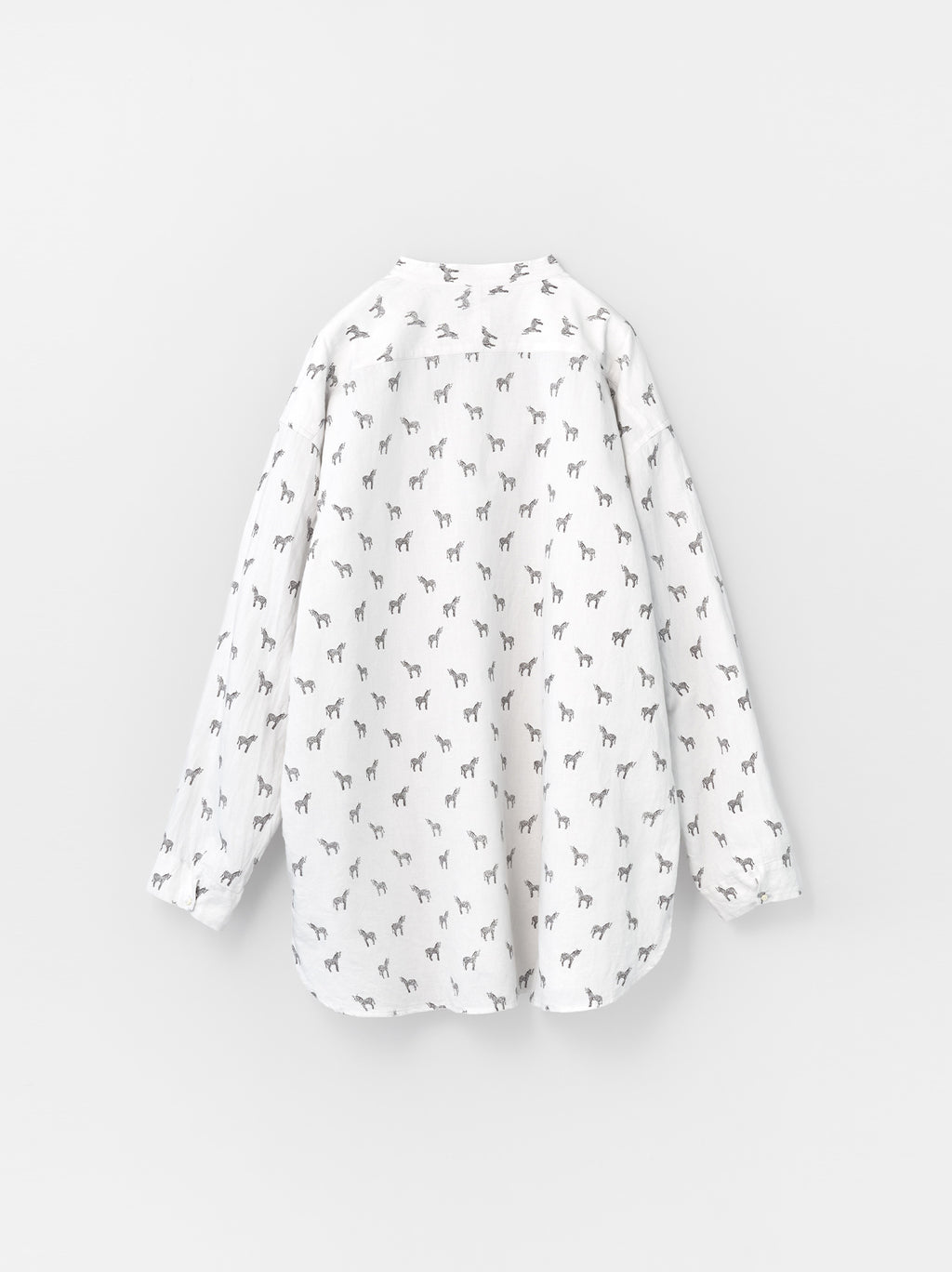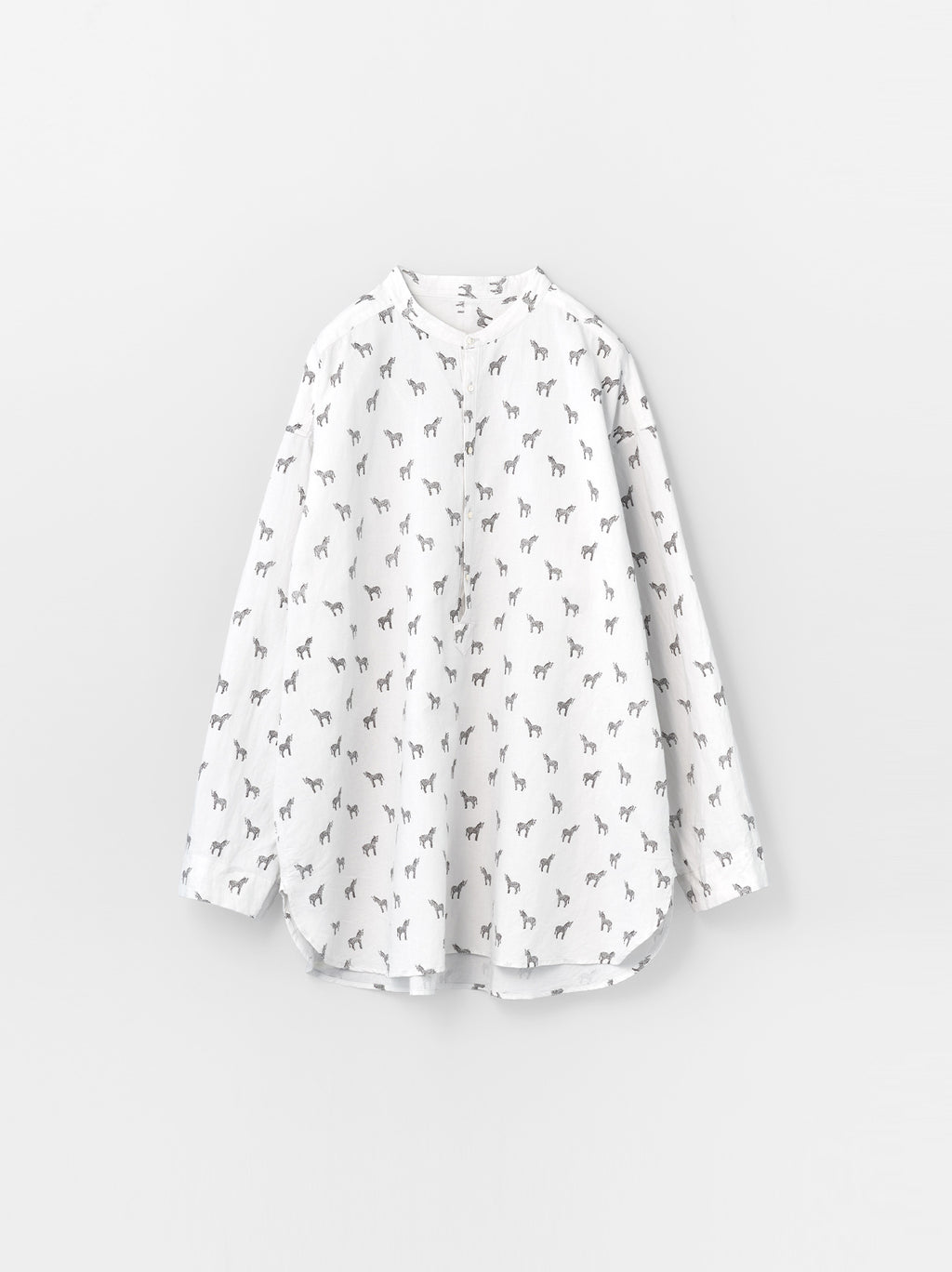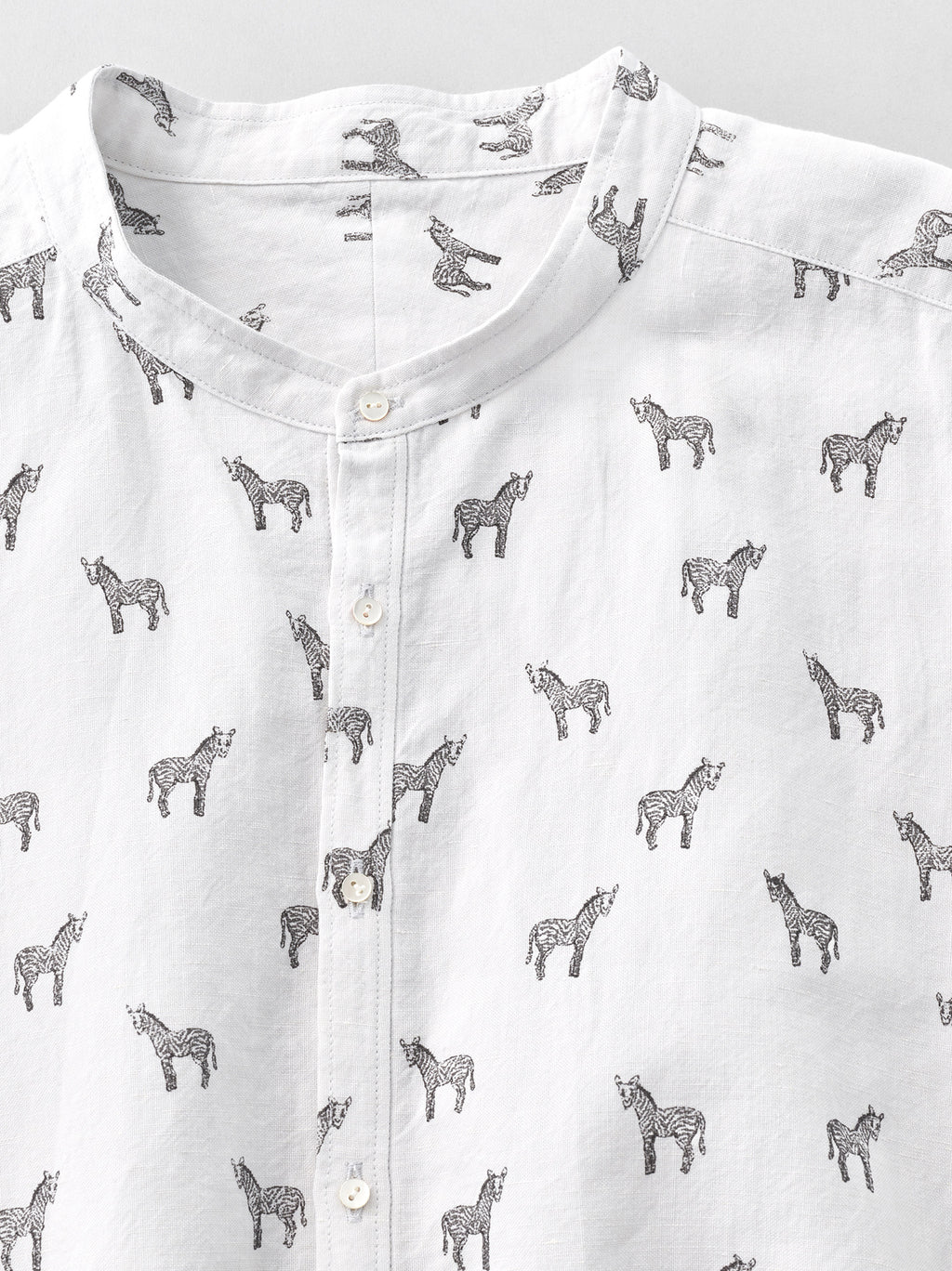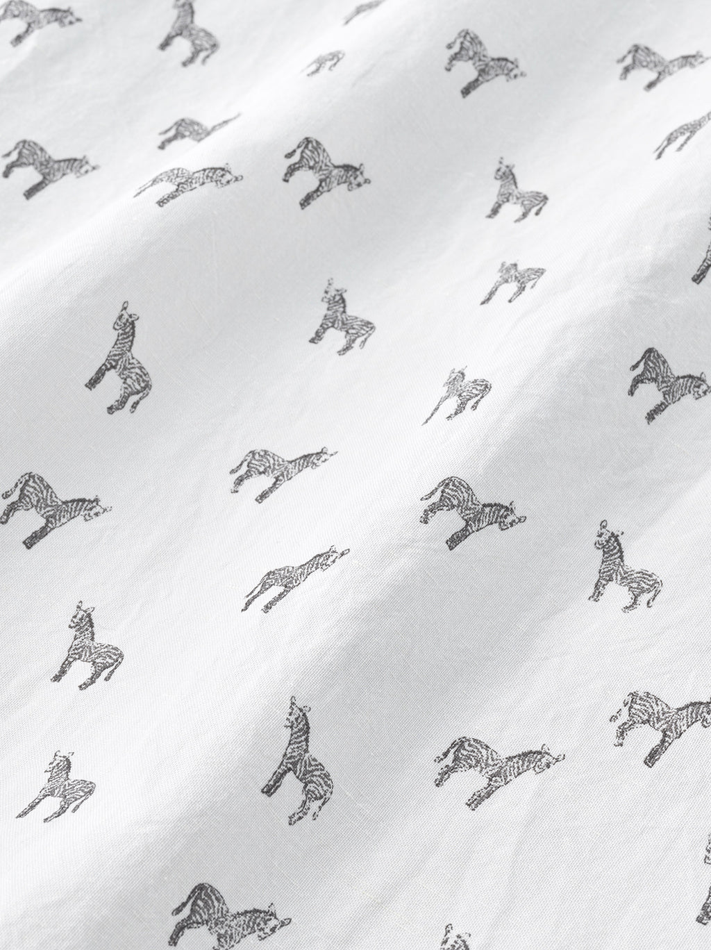 2026年の干支である『午(うま)』をモチーフにしたプリント柄のショート丈プルオーバーパジャマ。『ZEBRAS』と題して、コミカルな雰囲気を持ったシマウマで表現。8mmの小ぶりな貝ボタンを使用し、首回りや肩など全体的にゆとりを出したリラックスシルエットにすることで、パジャマやルームウェアとしての着心地を追求。Vintage white、Gray beigeの2色展開。同素材のSide seamless bulky pantsもご用意。