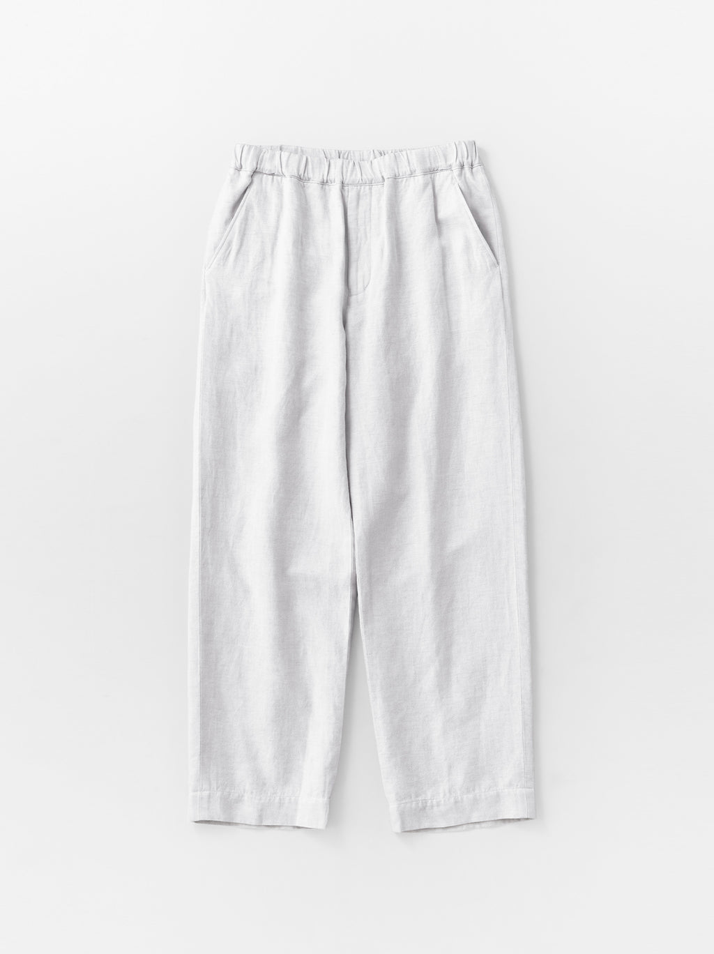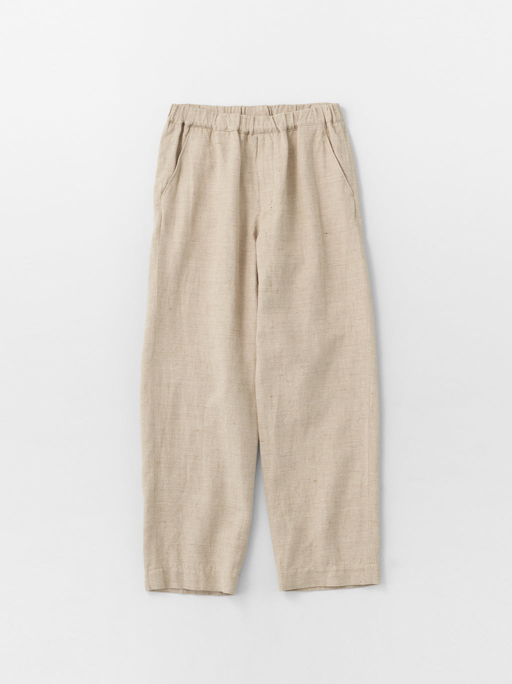 定番型のStandard easy tapered pantsをアレンジしたStraight easy pants。太すぎず細すぎない程良いストレートのシルエットが特徴。ウエストはゴムと紐のイージースタイルで、ヒップまわりにはゆとりを持たせている。縮絨と起毛を施したコットンとリネンの交織からなるヘリンボーンのネル生地はウールライクなウォーム感を持つ。ドローコードはウエスト内側に配されている。Vintage white、Mix brown、Mix beigeの3色展開。同生地のStand collar box shirtと合わせたセットアップとしても。