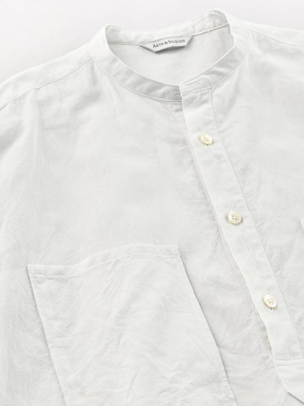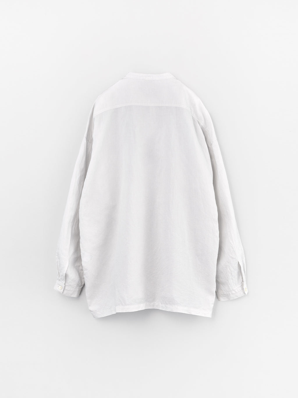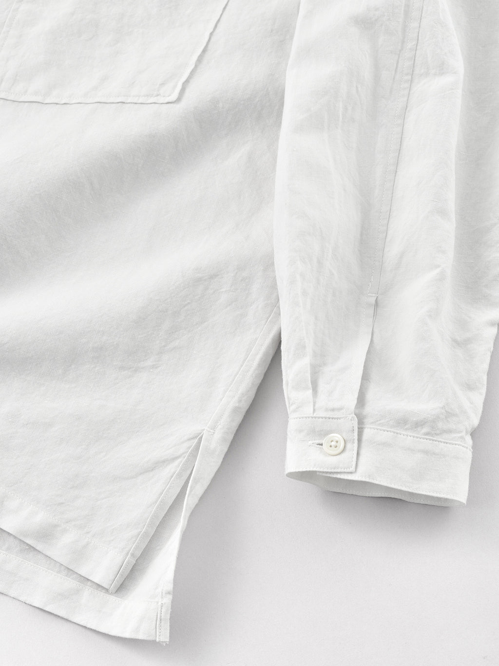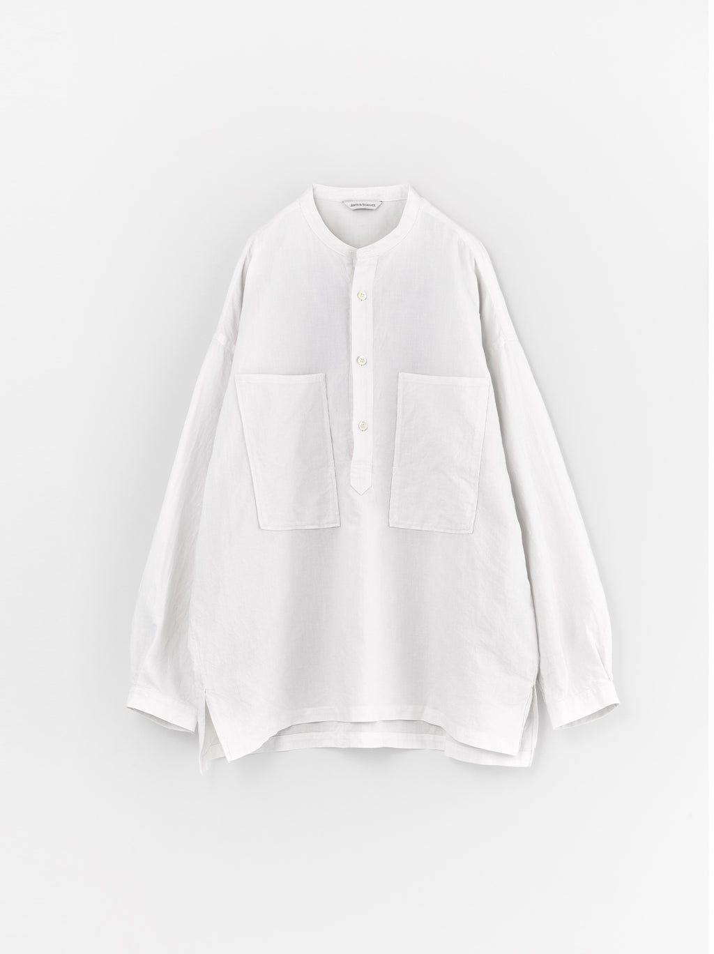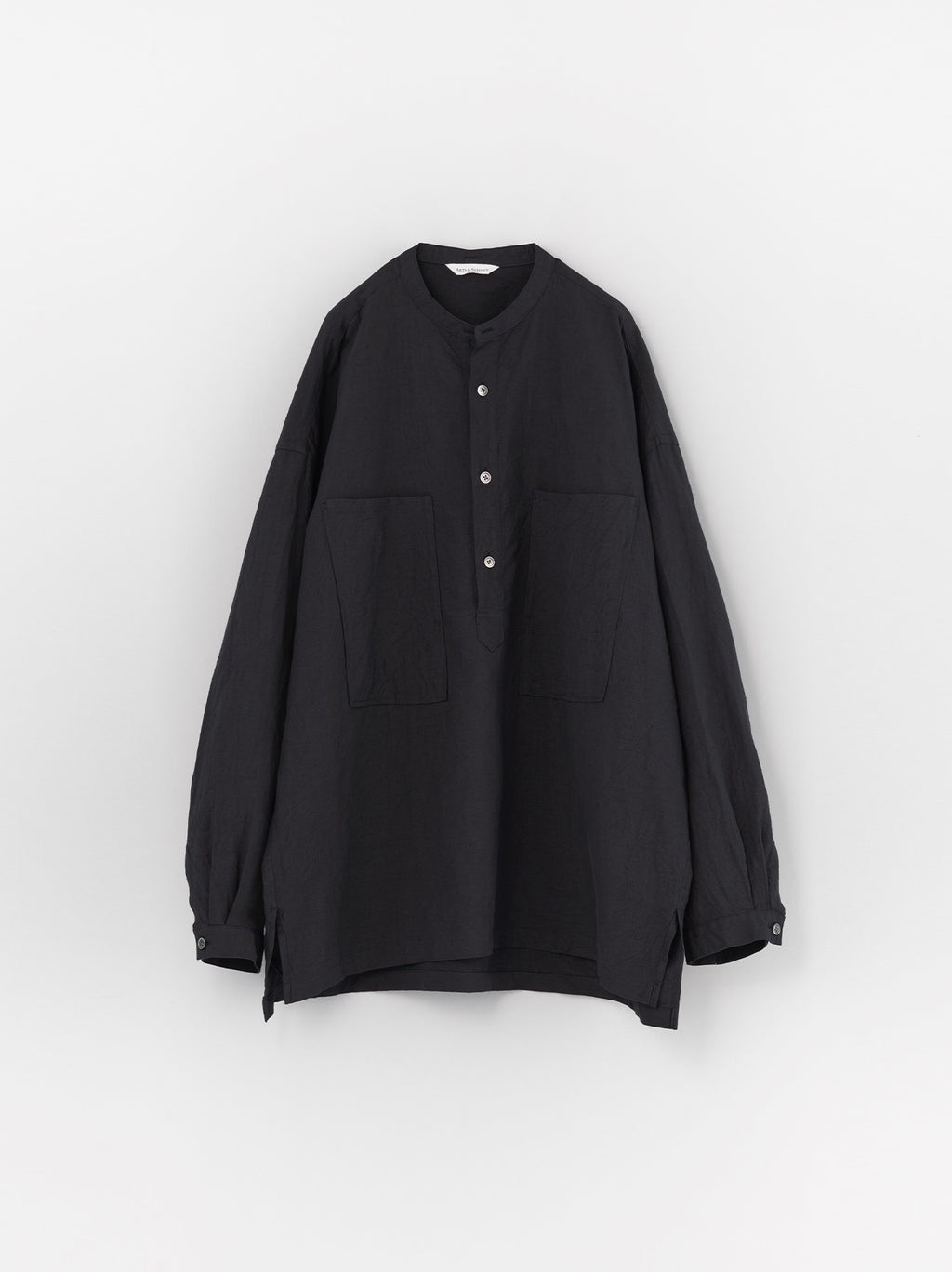 写真家のJacques-Henri Lartigue(ジャック=アンリ・ラルティーグ)が若かりし頃の肖像写真で着用されていたワークシャツをモチーフに製作されたLartigue shirt。両胸の大きなポケットが特徴で、ポケットは上部と側部からアクセスが可能。プルオーバー仕様でゆったりとしたバルキーなシルエット。生地はA&Sの定番生地“Cotton Linen OX”を使用。Vintage white、Light brown、Navy、Blackの4色展開。