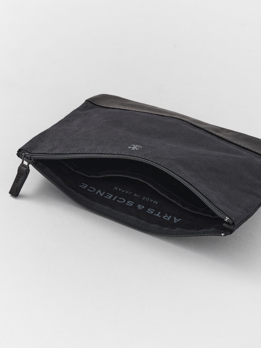 高密度のコットン生地とレザーを組み合わせたCombi pouch M。MサイズはA6サイズがゆったりと収まるサイズ感。バッグの中身の仕分けにも活用でき、旅行などに行く際の身の回り品をまとめていただくなどマルチな使い方が可能。高密度に織られた生地は耐水性、通気性、耐久性を兼ね備える。ファスナー先を含め、部分的に使用している革にはウォッシャブルレザーを採用しているため、水洗いができるのも魅力。製品洗いをすることで、こなれた風合いに仕上がっている。裏地が付かない1枚仕立ての作りで、共布の内ポケットが1つ備わる。外側にはカギマーク、内側にはARTS&SCIENCEのストレートロゴのプリントが入る。