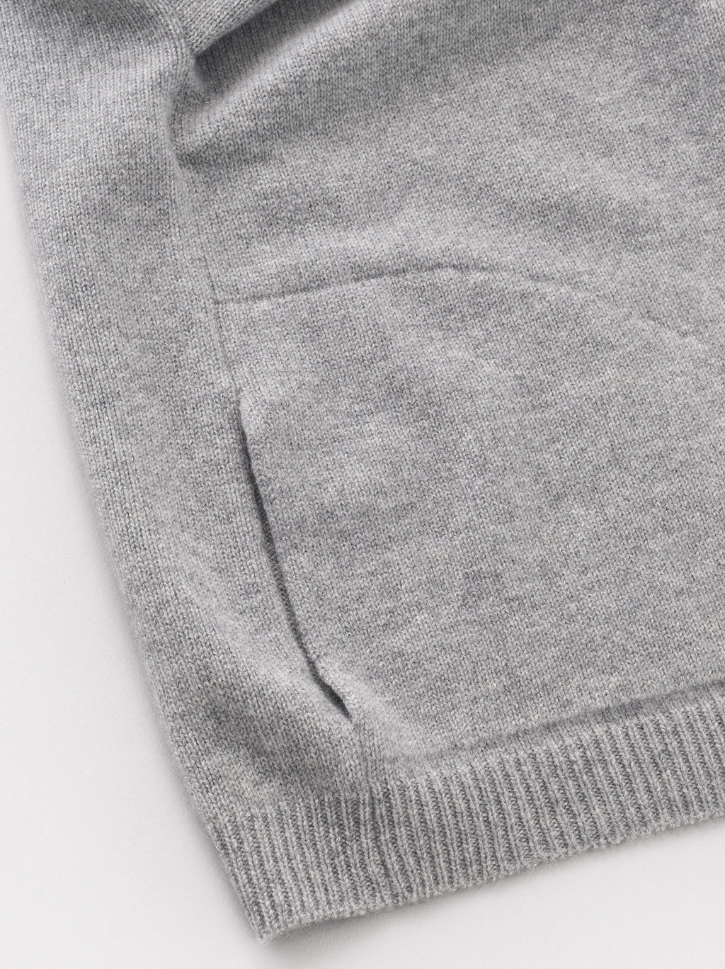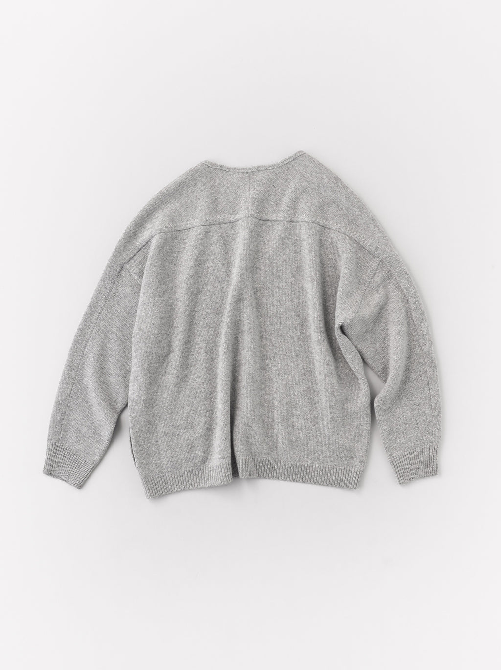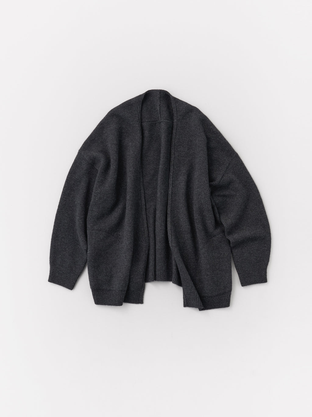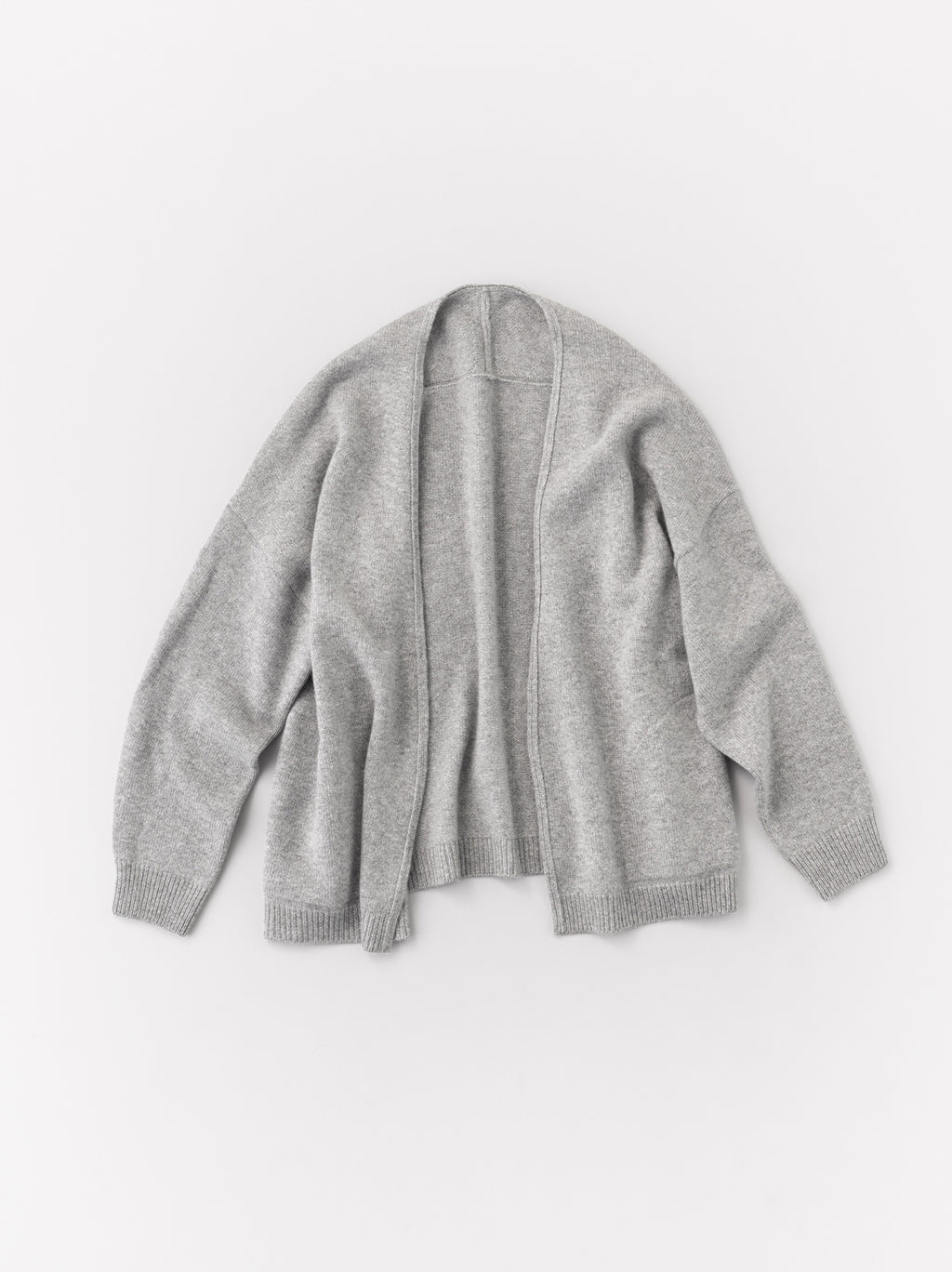 着物から着想を得た、Knit robe short。すっきりとしたショートレングスで、フロントが突合せになっているため、着用した際に柔らかなラインが現れる。ボタンレスのため、そのまま軽やかに羽織ることができる。キルトピンなどでフロントを留めて着用しても。生地はカシミア山羊の毛質に良い影響を与えるとされる寒暖差が激しい地域に限定し、選りすぐりのカシミアを使用。カシミアならではの優しい肌あたりで、ウールと比べて温度調節に優れ、気温が安定しない秋の暮れから、真冬、春先まで活躍する。ミドルレングスのKnit robe middleもご用意。