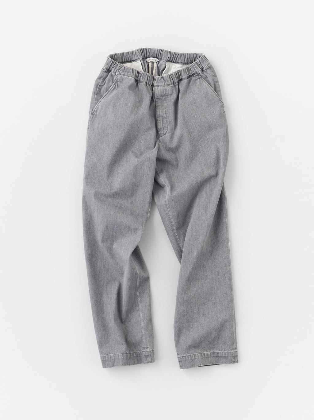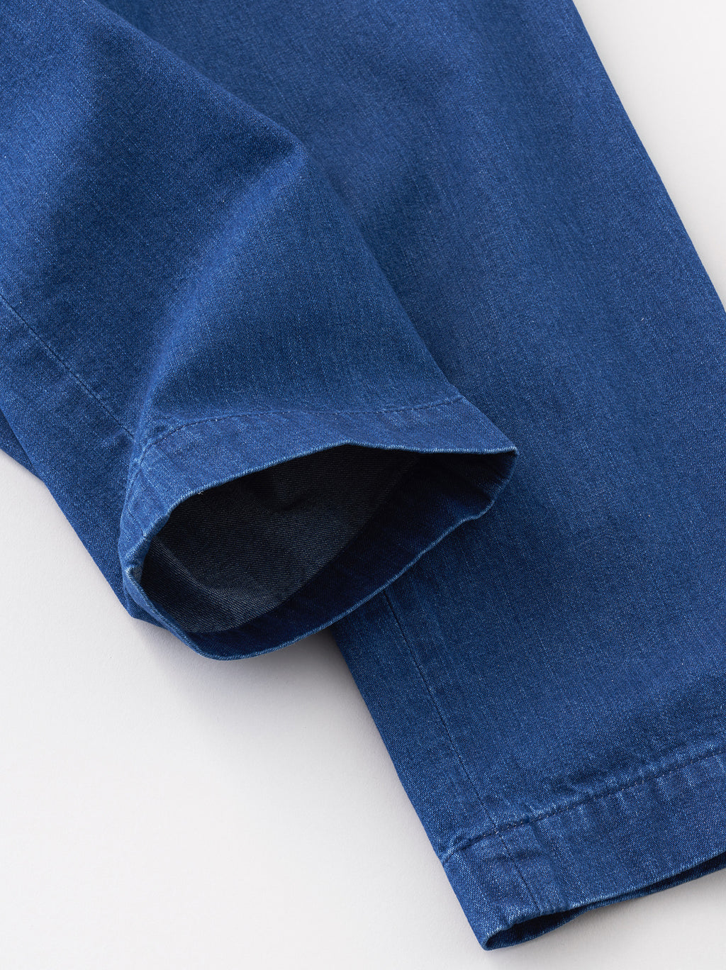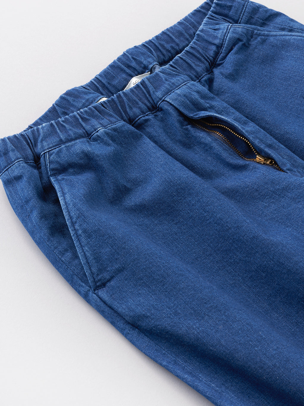 定番型のテーパードパンツ。程よいテーパードシルエットと、太すぎず細すぎないちょうど良いサイズ感。ヒップ周りにゆとりを持たせ、ウエストはゴムと紐のイージースタイル。硫化染めのデニムは、インディゴ染料では表現できない独特のブルーの色合いが特徴。