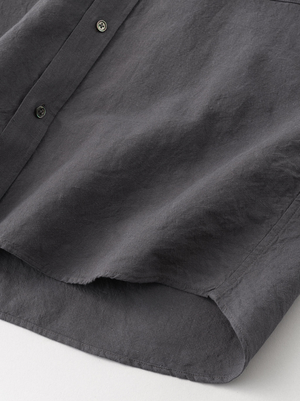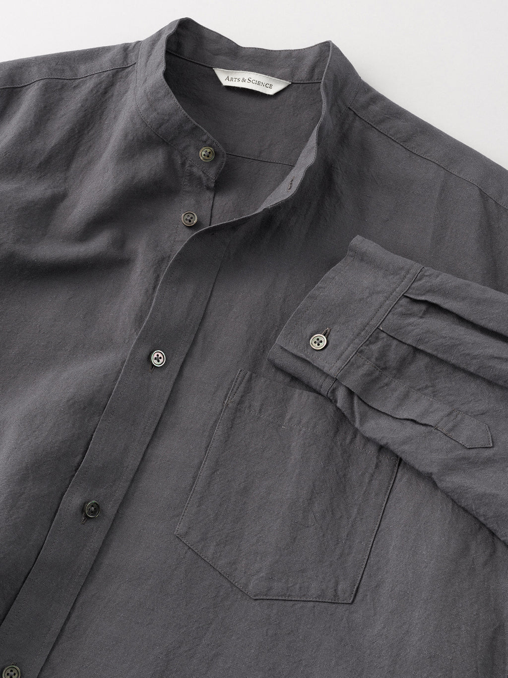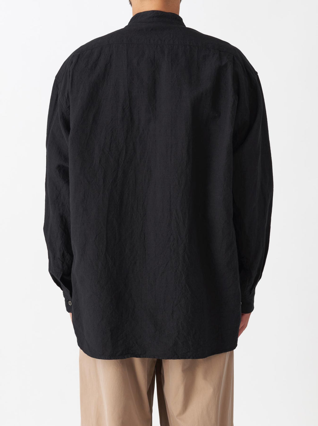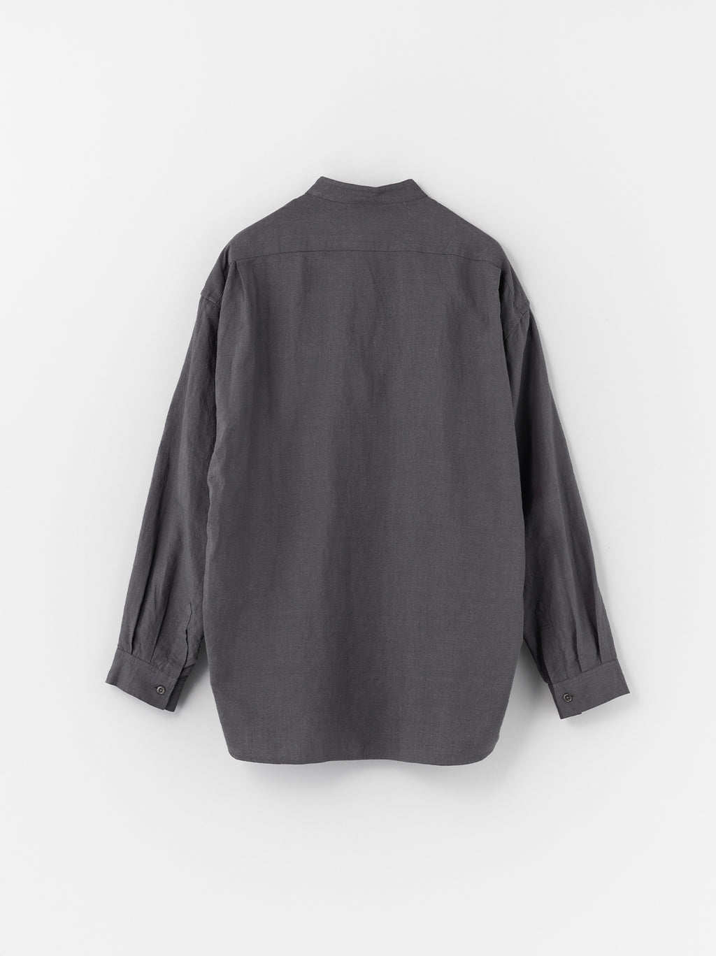 身幅に適度にゆとりを持たせたオーソドックスなバンドカラーシャツ。肩幅や袖周りにもゆとりがあり、快適に着用することができる。生地はA&Sの定番生地“Cotton Linen OX”を使用。